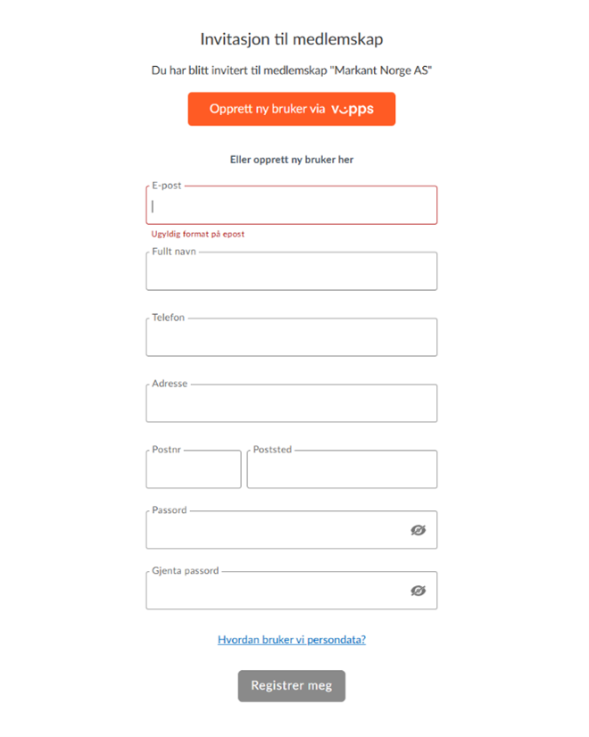 Når data utfylt, får du anledning å godta invitasjonen. Hvor din bruker kobles til Markants konto.