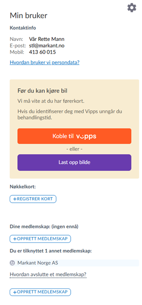 Når bruker er registrert må man få bekreftet at man har førerkort klasse B. Dette kan gjøres enten ved å identifisere seg via Vipps, eller ved å laste opp bilde av ditt førerkort.
